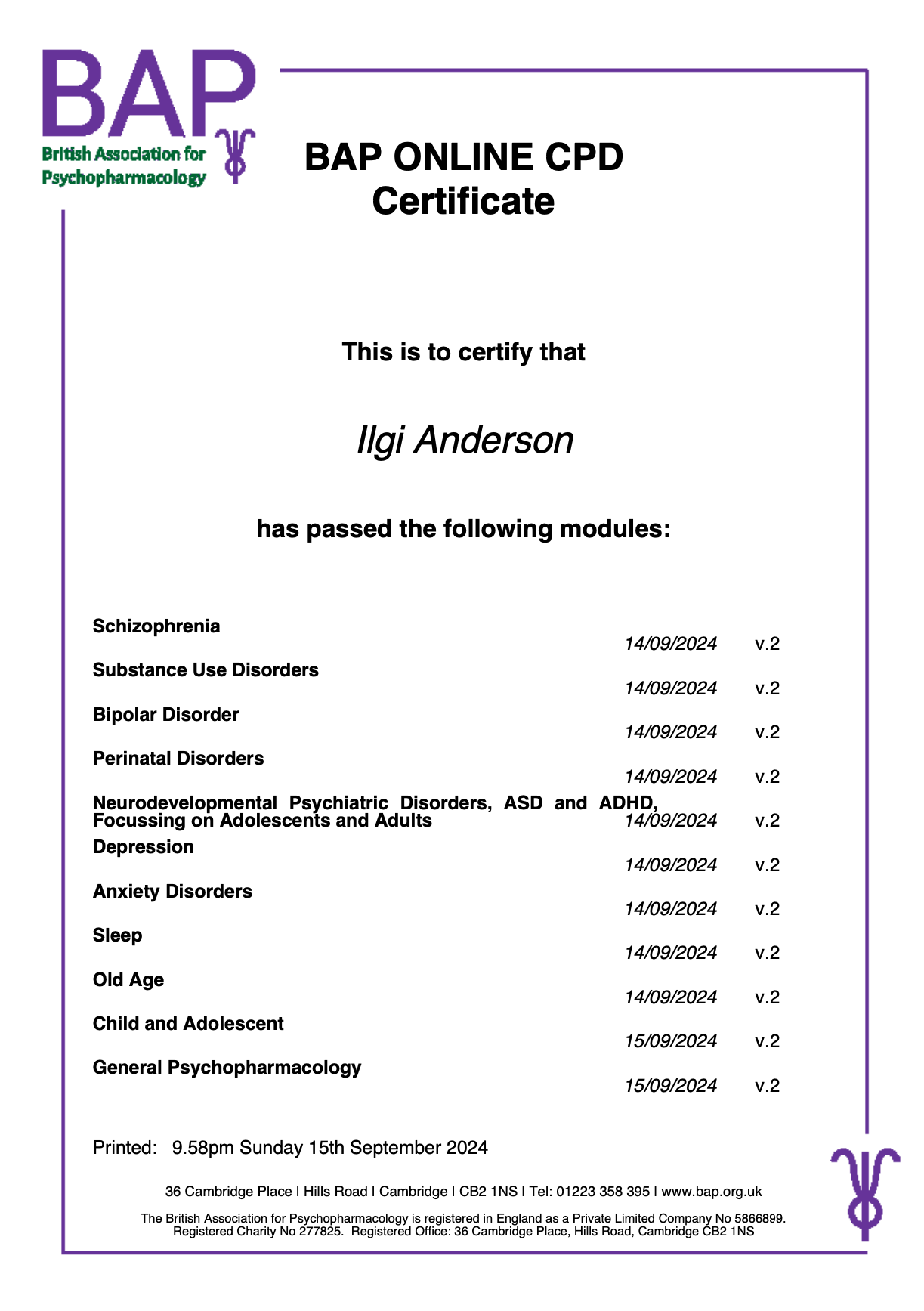 120 hour REBT course (Dr. Kristene Doyle & Dr. Murat Artiran) and CBT course (Prof. Dr. Zeynep Karatas)